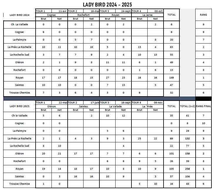 Classement définitif Lady Bird après La Prée le 4 novembre 2025 : Rochefort se classe 8ème